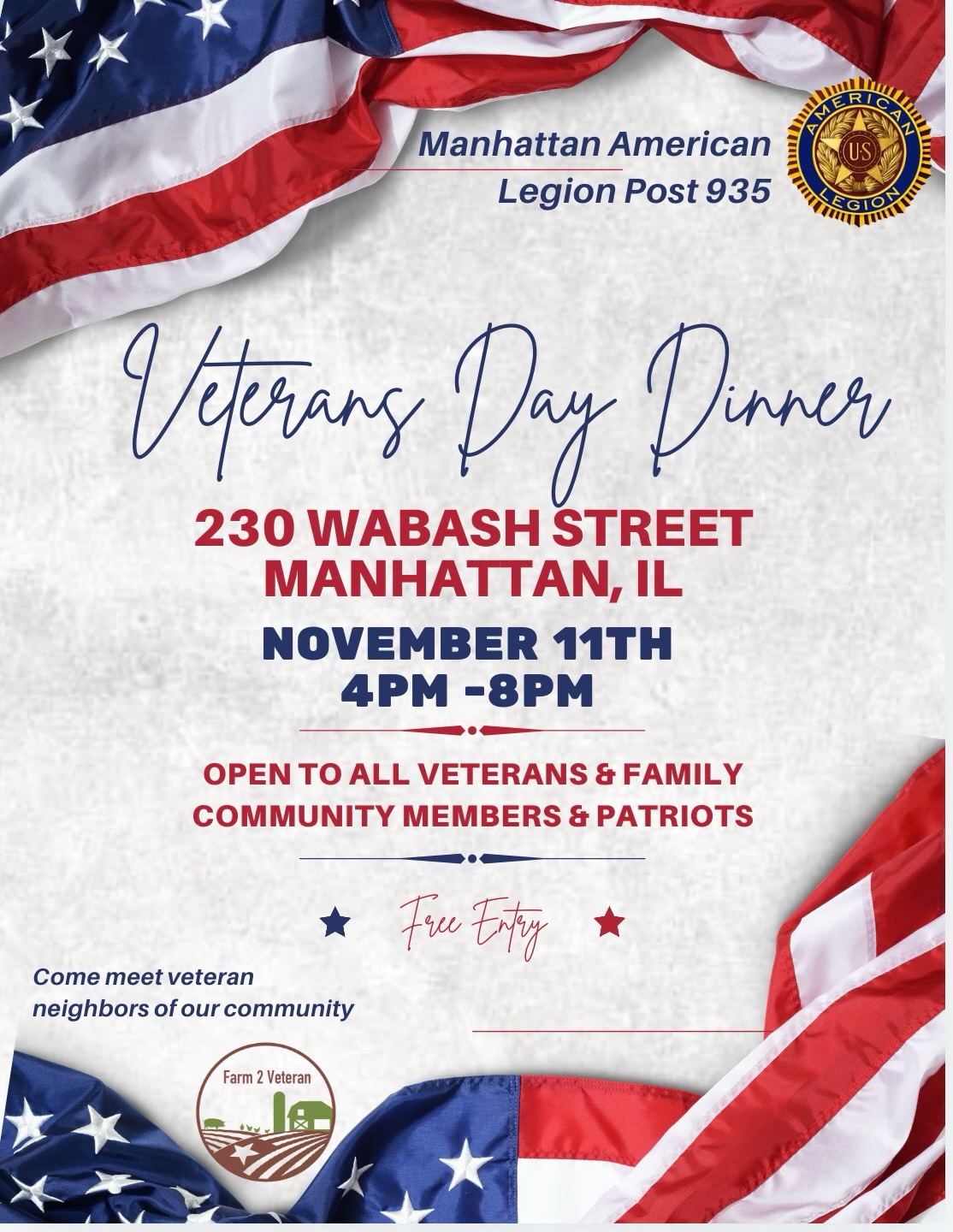 The Manhattan American Legion Post 935 is hosting an event on Veterans Day - Thursday, November 11, from 4:00 PM to 8 PM at the Manhattan Township Hall, located at 230 Wabash St. Manhattan, IL.